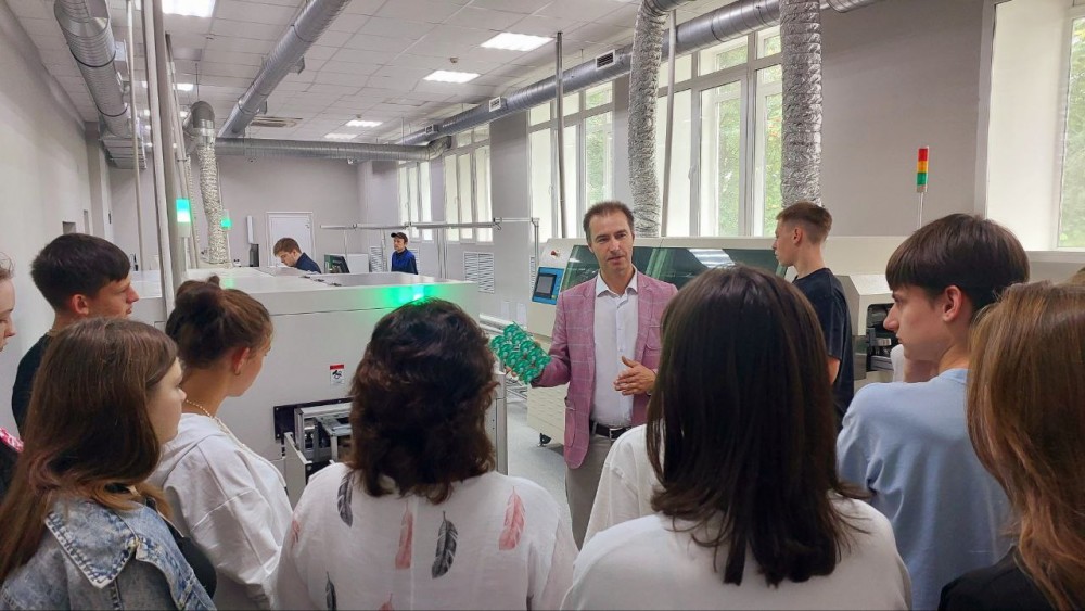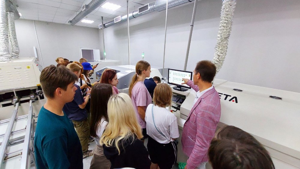 Экскурсию для школьников провел директор ИЦ ТЦС Денис Данилевич. Он подробно рассказал, как устроена производственная линия Центра, сотоящая из: автоматического загрузчика радиоэлектронных компонентов, принтера трафаретной печати, высокоскоростного прецизионного автоматического установщика SMD-компонентов, конвекционной печи и устройства автоматической выгрузки готовых печатных блоков и вспомогательного оборудования.