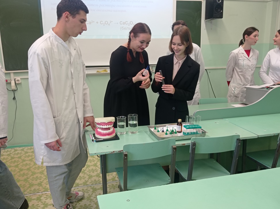 Участники мероприятия рассмотрели основные аспекты, связанные с предотвращением различных заболеваний полости рта, поддержанием здоровья зубов и гигиены ротовой полости. Обсудили проблему образования зубного налета, биохимические причины и последствия. Поговорили о мерах профилактики зубного камня, разрушения зубов. Также провели качественные реакции на макроэлементы, присутствующие в зубной ткани. Студенты-медики на модельной челюсти продемонстрировали присутствующим алгоритм корректной очистки полости рта. Будущие стоматологи поделились с аудиторией рекомендациями по профилактике и гигиене полости рта.