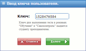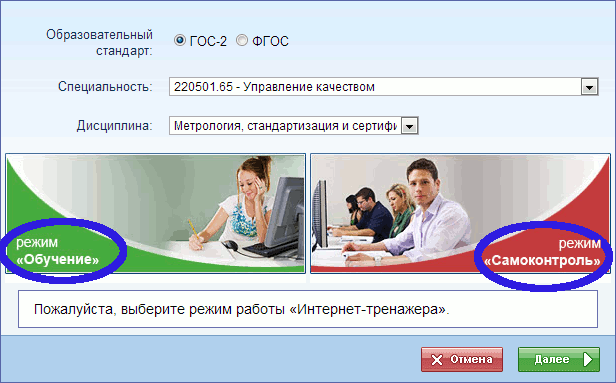 4) выбрать режим тестирования: «Обучение» (зеленый) или «Самоконтроль» (красный), щелкнув мышью по изображению требуемого режима: