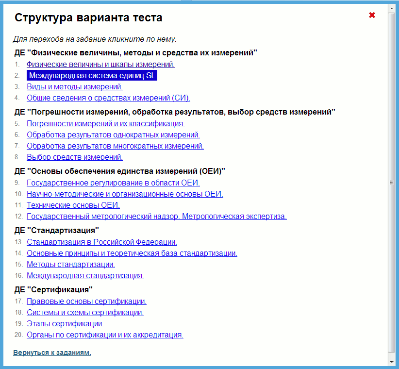 , расположенную в нижней части окна, студент получает доступ к структуре выполняемого им теста (рисунок 7), в которой приведены наименования дидактических единиц (ДЕ) выбранной дисциплины. Для перехода к тестовому заданию интересующей ДЕ достаточно щелкнуть мышью на названии.