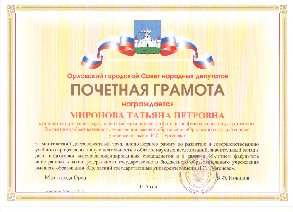 Дополнительная информация: Автор двух монографий, имеет 50 научных работ, в том числе опубликованных в таких ведущих отечественных изданиях, как журналы «Иностранные языки в школе» и «La Langue Française». Автор 25 учебно-методических работ, используемых в педагогической практике. Научные и творческие работы, выполненные студентами под руководством Т.П. Мироновой, занимают призовые места, отмечены грамотами и дипломами. Является членом оргкомитета конкурсов и олимпиад для школьников г. Орла и Орловской области, проводимых кафедрой романской филологии. Является экзаменатором международного экзамена по французскому языку DELF/DALF уровней А1 А2 В1 В2 C1 (удостоверение действительно до 20.01.2027). Является председателем предметной комиссии Межрегиональной оолимпиады школьников "Путь в науку". Является членом жюри и оргкомитета Всероссийского Фестиваля науки НАУКА 0+. Является членом жюри и оргкомитета Международного конкурса научных постеров «Студенческая наука без границ». Является членом жюри и оргкомитета Международного конкурса научных докладов среди учащихся средних общеобразовательных школ и студентов 1-2 курсов бакалавриата, изучающих иностранные языки, «Моя первая научная работа». Является членом жюри Всероссийского конкурса научно-исследовательских работ «Многоязычие и поликультурное образовательное пространство в России: современные тенденции» для бакалавров, магистрантов, аспирантов. Является членом жюри Всероссийского конкурса начинающих переводчиков «На грани культур, языков и идей» для студентов бакалавриата, магистратуры, аспирантов. Принимает участие в конференциях различного уровня, включая международные, среди которых Российско-французский коллоквиум, проведенный в рамках Года Россия – Франция «Франция – Россия: два народа – единая история и культура» (г. Орел, 2010). Награждена Почетной грамотой Орловского городского Совета народных депутатов (2016 г.), Почетной грамотой Департамента образования Орловской области (2023 г.). В ноябре 2024 г. активное и плодотворное сотрудничество в подготовке и реализации дополнительной общеобразовательной программы "Изучаем французский язык легко и с удовольствием!" отмечено Благодарностью регионального центра выявления, поддержки и развития способностей и талантов у детей и молодежи БОУ ОО "Созвездие Орла".