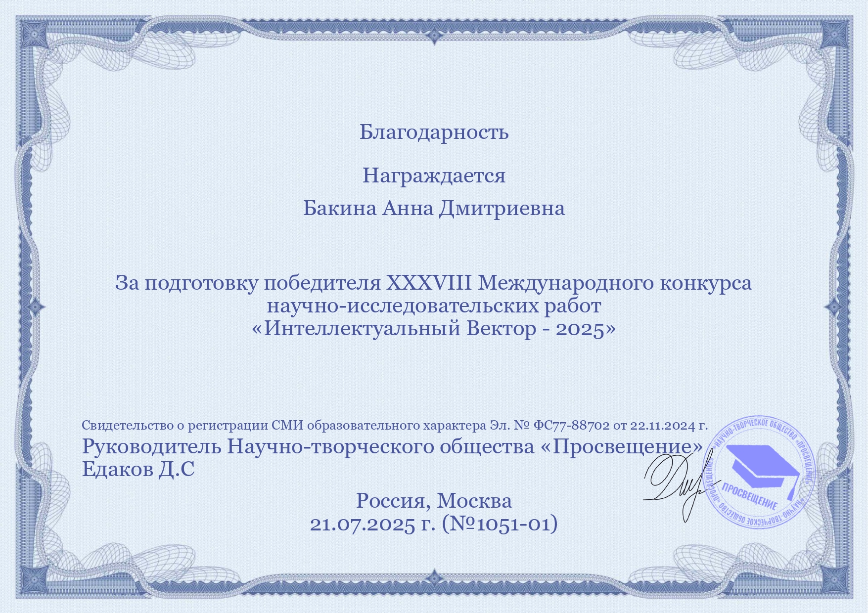 Публикации: 1. Бакина, А.Д. Актуальные проблемы фразеологии в контексте новейших исследований XXI века.: монография / А.Д. Бакина. - Издательский Дом "Академия Естествознания", 2025. - C.280. [Электронный ресурс]. - URL: https://elibrary.ru/item.asp?id=82966124. 2. Бакина, А.Д. Интегративное описание германской библейской фразеологии: монография / А.Д. Бакина. - ООО Модуль-К, 2025. - C.300. [Электронный ресурс]. - URL: . 3. Бакина, А.Д. К ВОПРОСУ О ПРАГМАТИКЕ ПЕРЕВОДА ФИЛЬМОНИМОВ / А.Д. Бакина // Теория языка и межкультурная коммуникация К3. - 2025. - № 3(58). - C.1-10. Doi: . [Электронный ресурс]. - URL: https://api-mag.kursksu.ru/api/v1/get_pdf/5863/. 4. Бакина, А.Д. и др. ПРАГМАТИКА ПЕРЕВОДА ФРАЗЕОЛОГИЧЕСКИХ ЕДИНИЦ БИБЛЕЙСКОГО ПРОИСХОЖДЕНИЯ В ПОЛИТИЧЕСКОМ ДИСКУРСЕ (на материале русского и английского языков) / А.Д. Бакина, В.А. Харченко // Вестник Северного (Арктического) федерального университета. - 2025. - № 3. - C.. Doi: . [Электронный ресурс]. - URL: . 5. Бакина, А.Д. и др. Современные исследования в фокусе сопоставительной фразеологии / А.Д. Бакина, Т.И. Койкова // Вестник Северного (Арктического) федерального университета, Серия «Гуманитарные и социальные науки. К2. - 2025. - № 2. - C.124-128. Doi: 10.37482/2687-1505-V427. [Электронный ресурс]. - URL: https://www.elibrary.ru/item.asp?id=82268478. 6. Бакина, А.Д. Способы прагматической адаптации при переводе текстов художественного дискурса / А.Д. Бакина // Вестник Московского государственного лингвистического университета. - 2025. - № 3. - C.. Doi: . [Электронный ресурс]. - URL: . 7. Бакина, А.Д. The Study of the Biblical Conceptosphere: the Binary Concept LIGHT/DARKNESS / А.Д. Бакина // Когнитивные исследования языка. - 2024. - № 2(58). - C.91-95. Doi: . [Электронный ресурс]. - URL: . 8. Абакумова, О.Б. и др. VIII Международная научно-практическая конференция «Язык. Культура. Коммуникация: изучение и обучение». Орел, 10-11 октября, 2024 / О.Б. Абакумова, А.Д. Бакина // Art Logos (Искусство слова) К 3. - 2024. - № 4(29). - C.186-196. Doi: 10.35231/25419803_2024_4_186. [Электронный ресурс]. - URL: https://lengu.ru/mag/art-logos/archive/145. 9. Бакина, А.Д. Анализ библейских концептов ‘soul’ / ‘душа’ и ‘spirit’ / ‘дух’ / А.Д. Бакина // "Актуальные вопросы германистики, романистики, русистики ", Екатеринбург, 01.01.1900. - Екатеринбург: Уральский государственный педагогический университет. , 2024. - C.12-19. Doi: . [Электронный ресурс]. - URL: . 10. Бакина, А.Д. Библейская фразеология в современной коммуникации / А.Д. Бакина // IV Всерос. науч. семинар для молодых ученых с междунар. участием, посвящ. 90-летию со дня рождения В. В. Колесова, Владимир, 01.01.1970. - Владимир: , 2024. - C.494-504. Doi: . [Электронный ресурс]. - URL: .