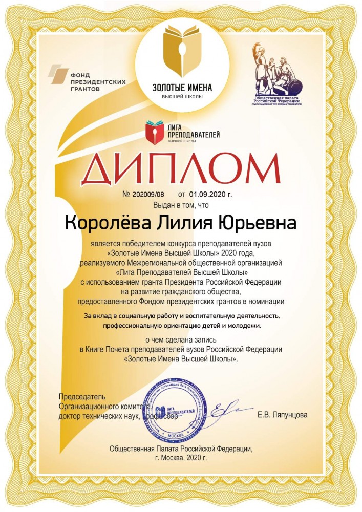 С 2017 года МОО «Лига Преподавателей Высшей Школы» при поддержке Фонда президентских грантов реализует проект "Золотые Имена Высшей Школы", представляющий собой ежегодный конкурсный отбор среди представителей профессорско-преподавательского состава вузов по ключевым направлениям работы: учебная, воспитательная, научная, методическая и другие. Конкурс призван повысить престиж профессии преподавателя высшей школы и создать дополнительные стимулы к повышению качества образования и обмену передовыми образовательными методиками.