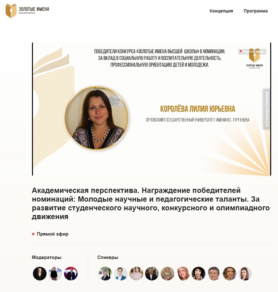 В 2020 году для участия в Конкурсе было подано 634 заявки из 73 регионов России. Победителем Конкурса в номинации «За вклад в социальную работу и воспитательную деятельность, профессиональную ориентацию детей и молодежи» стала старший преподаватель кафедры внутренних болезней Медицинского института ОГУ имени И.С. Тургенева Королёва Лилия Юрьевна, представившая для участия в конкурсе заявку о своей деятельности в рамках профориентационной работы с абитуриентами Медицинского института.