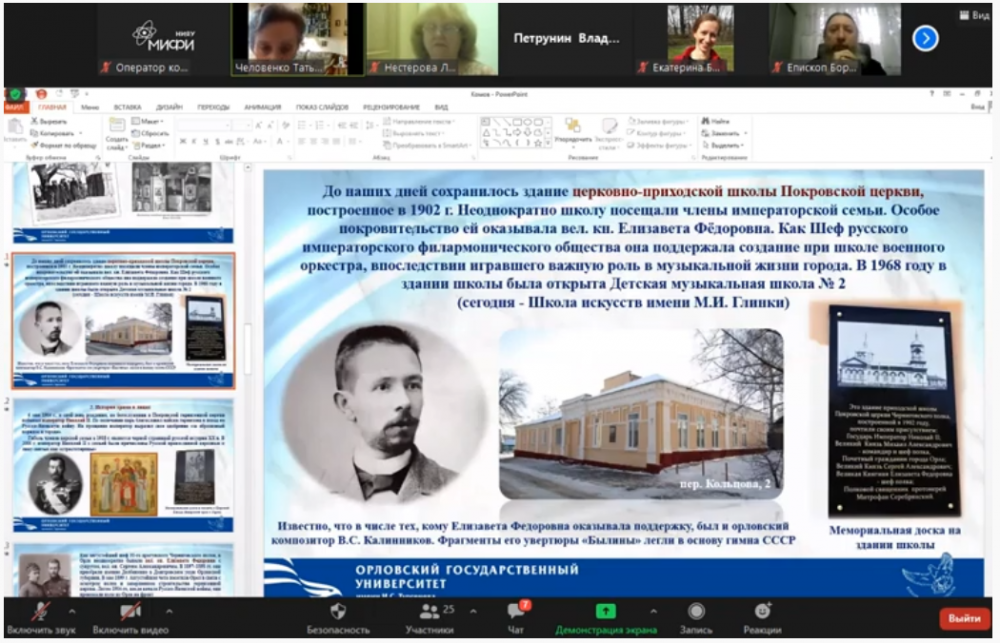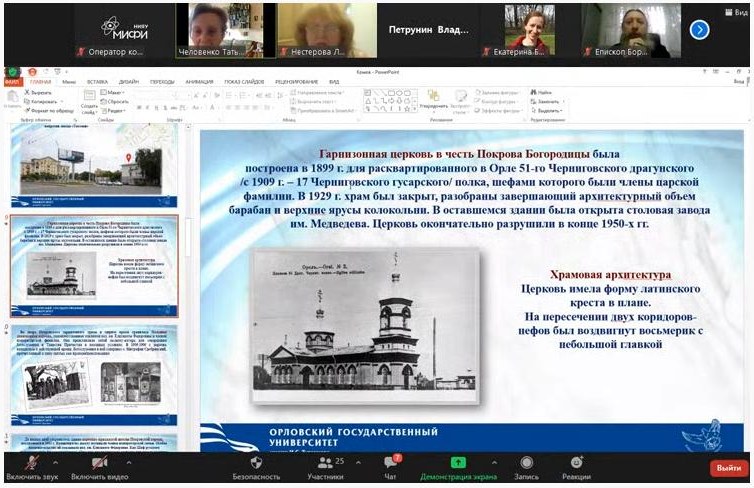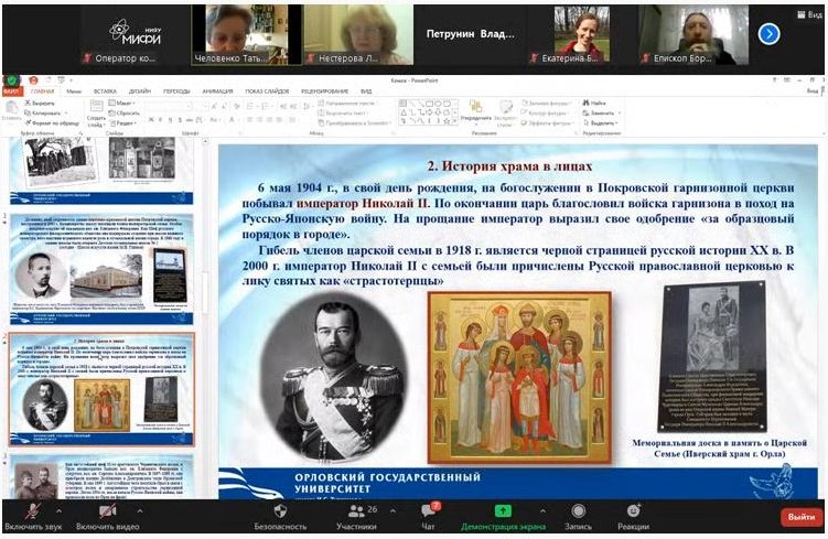 Человенко Т.Г., зав. кафедрой теологии, религиоведения и культурных аспектов национальной безопасности, представила мастер-класс «Проект «Утраченные храмы Орловщины: история в лицах, христианство в реликвиях»: реализация комплексного подхода к воспитанию гражданственности у студентов-теологов» с показом презентации.