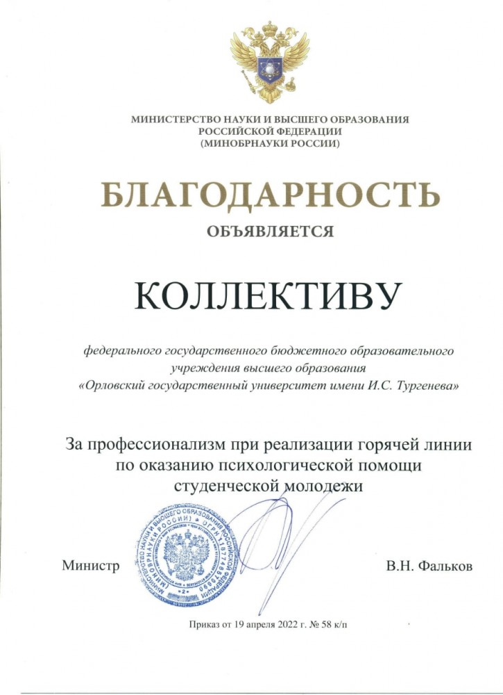 Минобрнауки РФ объявило Благодарность коллективу Орловского государственного университета имени И. С. Тургенева за профессионализм при реализации горячей линии по оказанию психологической помощи студенческой молодежи.