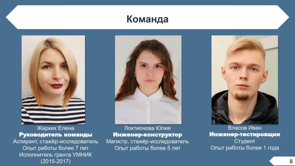 Первый победивший проект – «Двухканальный носимый оптический монитор микроциркуляции крови и тканевого метаболизма», коллектив – стажер-исследователь, аспирант направления 12.06.01 «Фотоника, приборостроение, оптические и биотехнические системы и технологии» Елена Жарких; стажер-исследователь, студент направления 12.04.04 «Биотехнические системы и технологии» Юлия Локтионова; студент направления 12.03.04 «Биотехнические системы и технологии» Иван Власов.