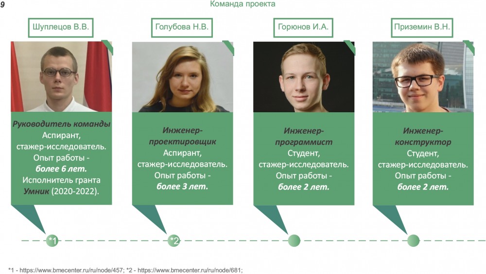 Второй победивший проект – «Разработка системы гиперспектральной визуализации для экспресс-диагностики жизнеспособности биотканей», коллектив: стажер-исследователь, аспирант направления 12.06.01 «Фотоника, приборостроение, оптические и биотехнические системы и технологии» Валерий Шуплецов; стажер-исследователь, аспирант научной специальности 2.7.1 «Биотехнологии пищевых продуктов, лекарственных и биологически активных веществ» Надежда Голубова; стажеры-исследователи, студенты направления 12.03.01 «Приборостроение» Вадим Приземин и Илья Горюнов.