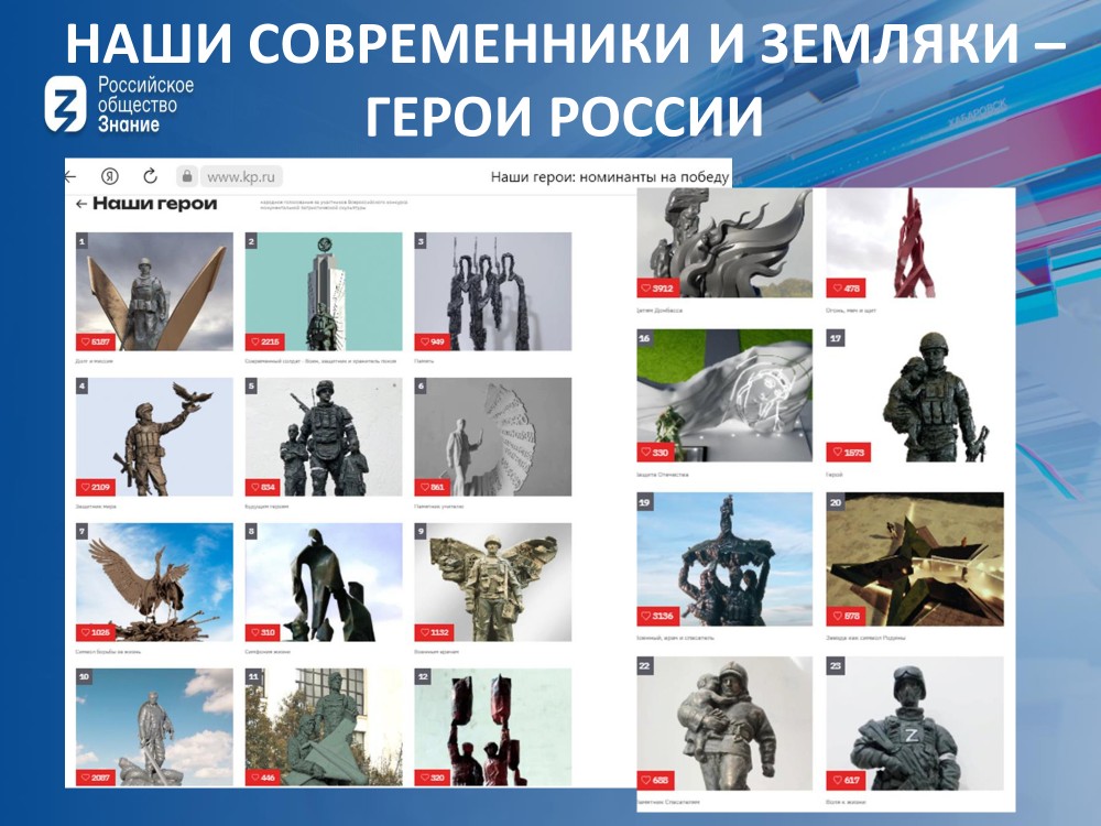 Особое внимание лектор уделила сохранению исторической памяти о подвигах земляков в виде памятных досок на школах, которые они закончили, баннеров на оживленных улицах города, саженцев молодых деревьев в парке Победы, улиц, названных в честь героев. Весной этого года был объявлен конкурс проектов памятников «Наши герои». Слушатели рассмотрели работы финалистов и точно определили победителя – скульптуру «Честь и миссия», изображающую современного солдата, уже установленную в Москве.