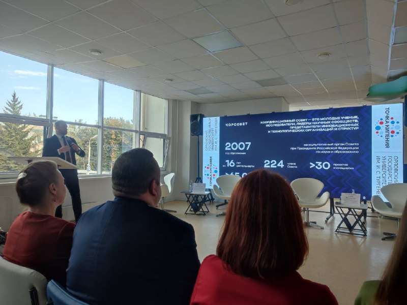 23 сентября в рамках форума «Наука будущего – наука молодых» в Точке кипения Орловского государственного университета имени И. С. Тургенева прошла встреча Координационного совета по делам молодежи в научной и образовательной сферах Совета при Президенте Российской Федерации по науке и образованию с представителями СМУ (совет молодых ученых) и СНО (студенческое научное общество) Орловской области.