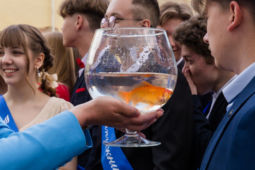 Поддержали выпускников родители, которые подарили сразу два сценических номера: зажгли под современные музыкальные тренды в ярком танце и спели всем знакомые песни, которые вызвали у детей слёзы восторга и светлой грусти. Кульминацией мероприятия стала оригинальная традиция гимназии – загадывание желания у настоящей золотой рыбки. Выпускникам раздали небольшие жемчужины, которые нужно было зажать в ладонь и при этом подумать о своих заветных мечтах, после чего все жемчужины были брошены в аквариум к символу гимназии – золотой рыбке.