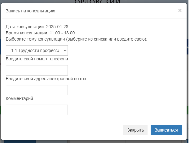 В открывшемся окне выберите тему консультации и укажите свои контактные данные.