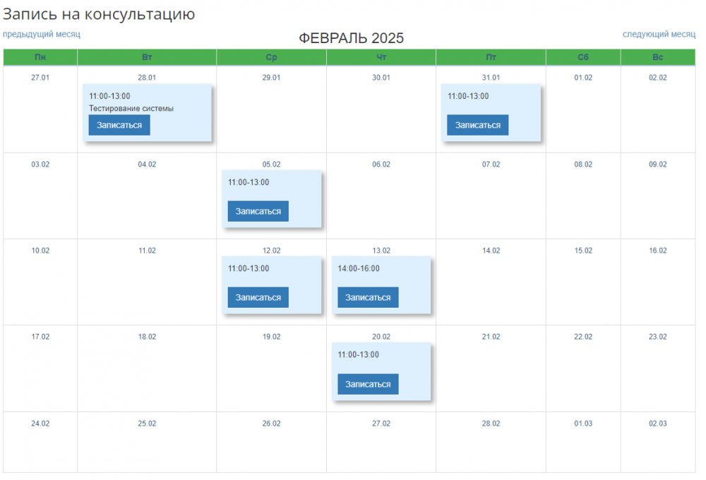 На странице сервиса выберите одну из свободных дат консультаций в календаре и нажмите кнопку «Записаться».