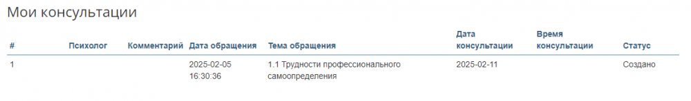 После нажатия кнопки "Записаться" инфомация о вашей заявке на консультацию попадёт к сотрудникам службы социально-психологической поддержки университета. После рассмотрения заявки вам будет назначен педагог-психолог который будет проводить консультацию и уточнено точное время консультации. Информация о ваших записях на консультации будет отображаться в разделе «Мои консультации».