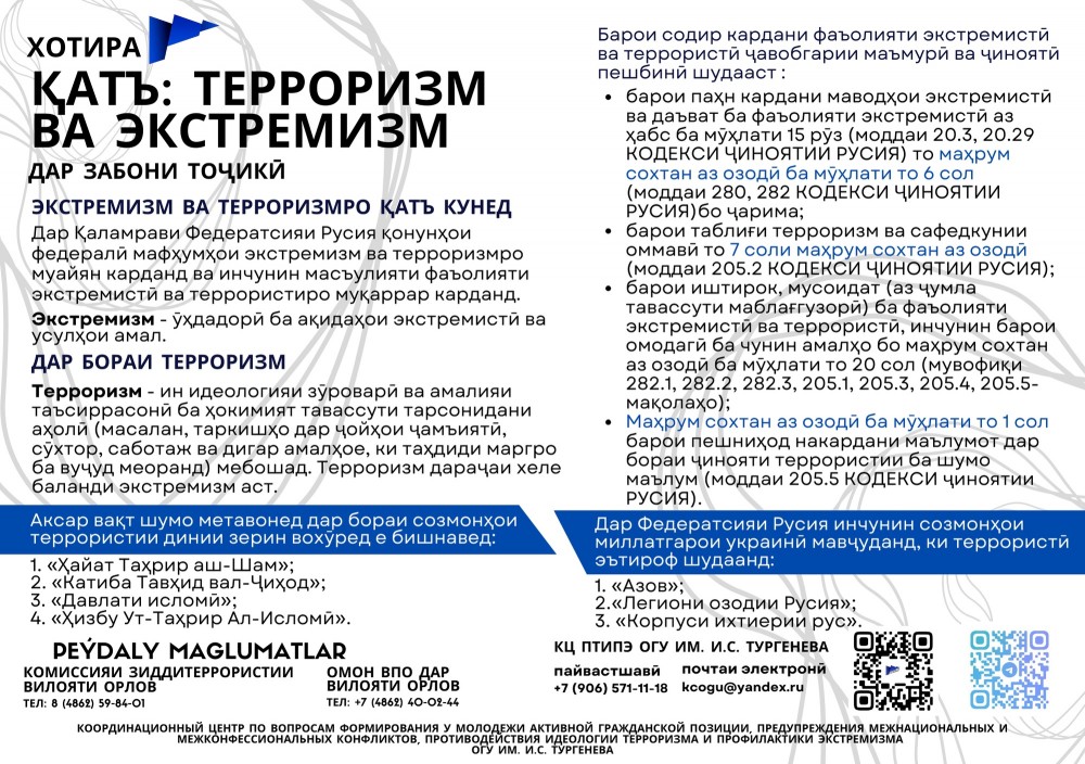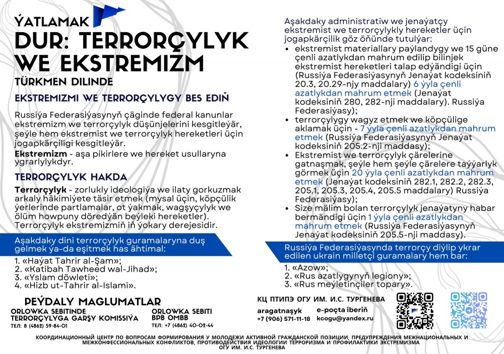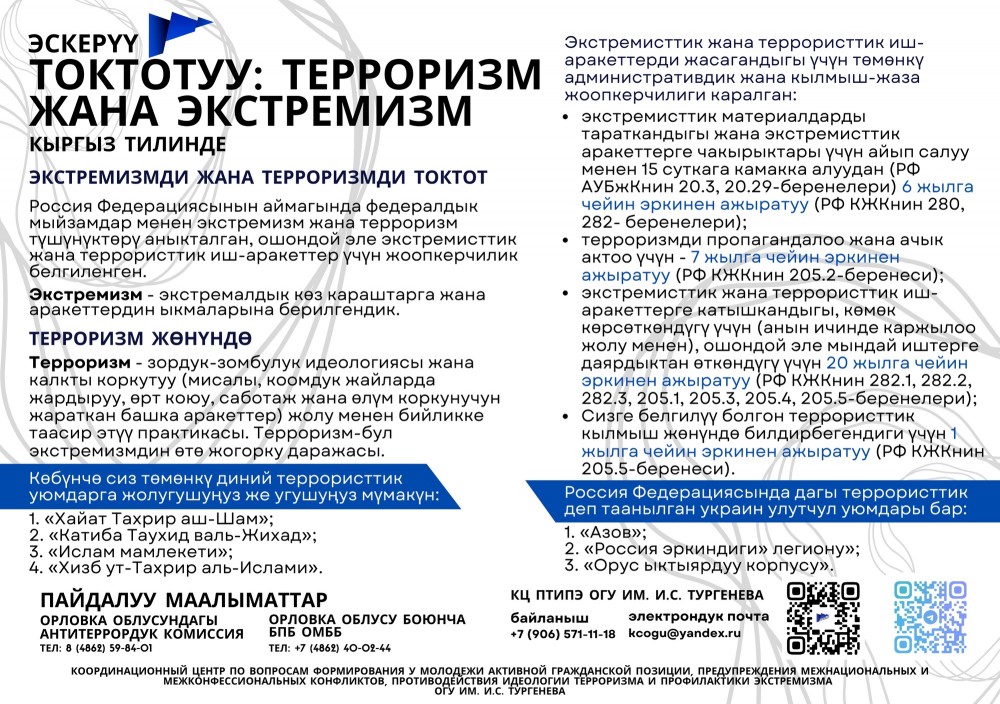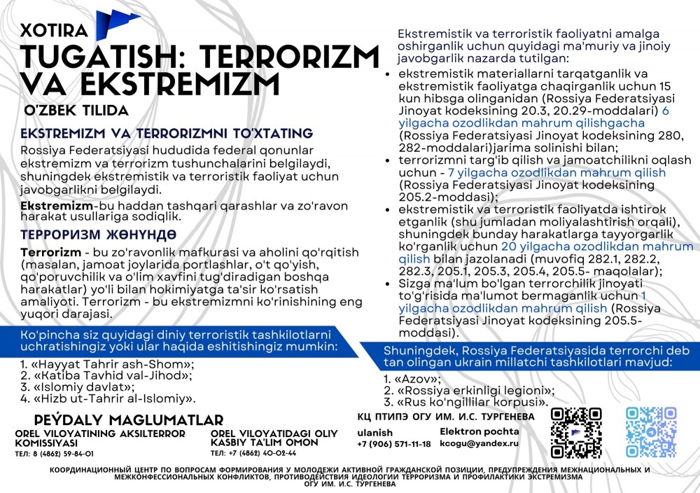 КЦ ПТиПЭ ОГУ им. И.С. Тургенева подготовил карточки антитеррористической тематики для студентов из стран Центрально-Азиатского региона. В материалах на киргизском, узбекском, таджикском и туркменском языках объясняются понятия «экстремизма» и «терроризма», приведен перечень признанных в РФ террористическими организаций, которые ведут свою деятельность в их странах, а также дана информация об административной и уголовной ответственности.