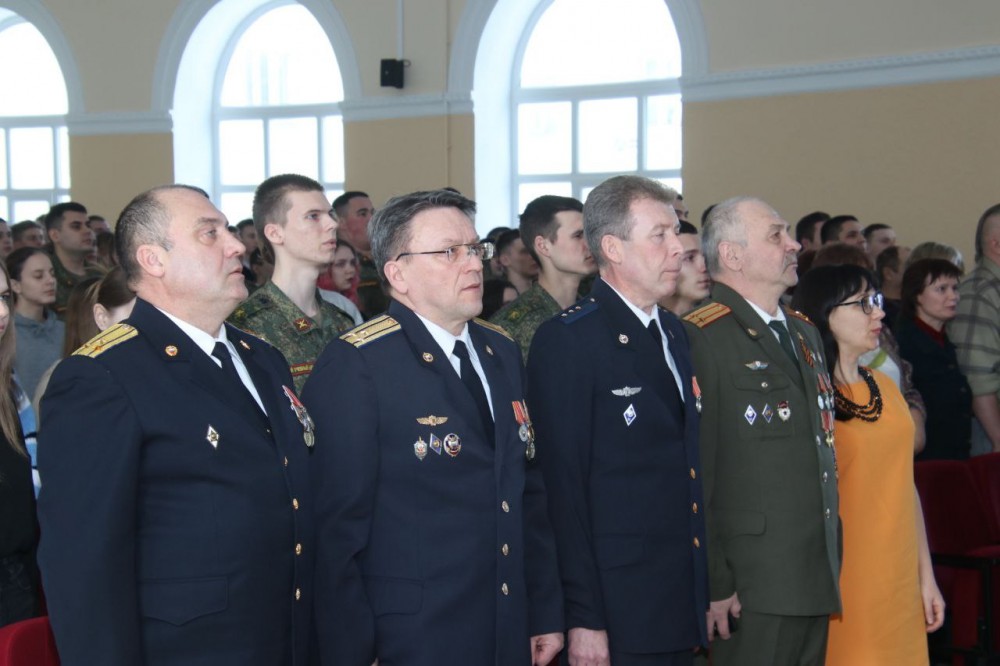 Торжественная часть началась с выноса на сцену флага Российской Федерации. Под командованием начальника Военного учебного центра полковника Максима Христофорова курсанты вынесли флаг на сцену, после чего прозвучал гимн.