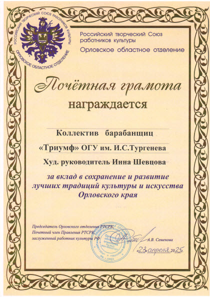 Коллектив барабанщиц «Триумф» Орловского государственного университета им. И.С.Тургенева (художественный руководитель Инна Шевцова) награжден почетной грамотой от Орловского областного отделения Российского творческого Союза работников культуры за вклад в сохранение и развитие лучших традиций культуры и искусства Орловского края.