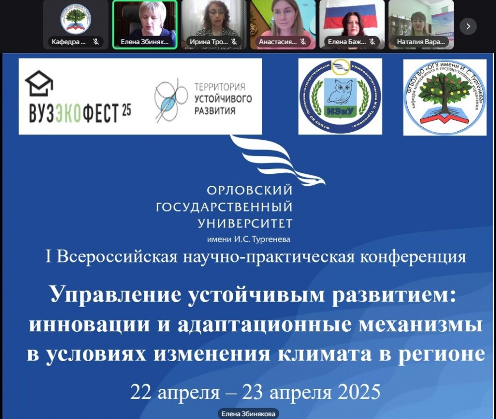 С 22 по 23 апреля на базе Орловского государственного университета имени И.С. Тургенева» прошла I Всероссийская научно-практическая конференция «Управление устойчивым развитием: инновации и адаптационные механизмы в условиях изменения климата в регионе», посвящённая вопросам управления устойчивым развитием, его теоретическим и практическим особенностям, проблемам и перспективам в условиях климатических изменений. Конференция проводилась в онлайн формате с подключением к цифровым платформам.
