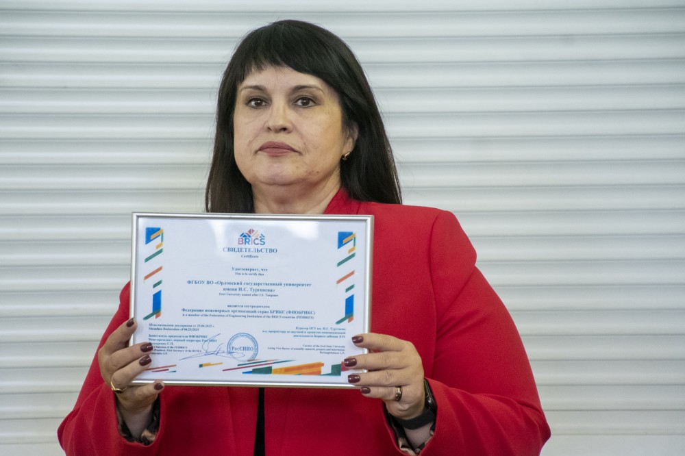 Российский Союз научных и инженерных общественных объединений выдал свидетельство о том, что Орловский государственный университет им. И.С. Тургенева является соучредителем Федерации инженерных организаций стран БРИКС (ФИОБРИКС).