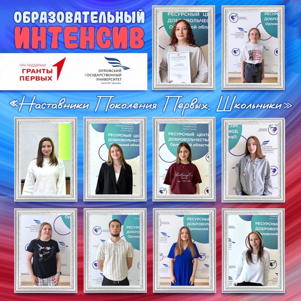 Итогом образовательного интенсива «Наставники Поколения Первых. Школьники» является обучение 400 школьников различным направлениям волонтерской деятельности на базе 10 школ: Гимназия №1 ФГБОУ ВО «Орловский государственный университет», Муниципальное бюджетное общеобразовательное учреждение - лицей №28 г. Орла имени дважды Героя Советского Союза Г.М.Паршина, Муниципальное бюджетное общеобразовательное учреждение - Средняя общеобразовательная школа № 17 с углубленным изучением французского языка имени 6-ой Орловско - Хинганской стрелковой дивизии г. Орла, Бюджетное общеобразовательное учреждение Орловской области «Некрасовская общеобразовательная школа», МББОУ Лицей №40 г.Орла, БОУ Орловской области «Созвездие Орла», МБОУ «СОШ имени П.В. Киреевского» Орловского муниципального округа, МБОУ-Гимназия № 34 г.Орла, МБОУ средняя общеобразовательная школа №6 города Орла, МБОУ средняя общеобразовательная школа №2 города Орла.