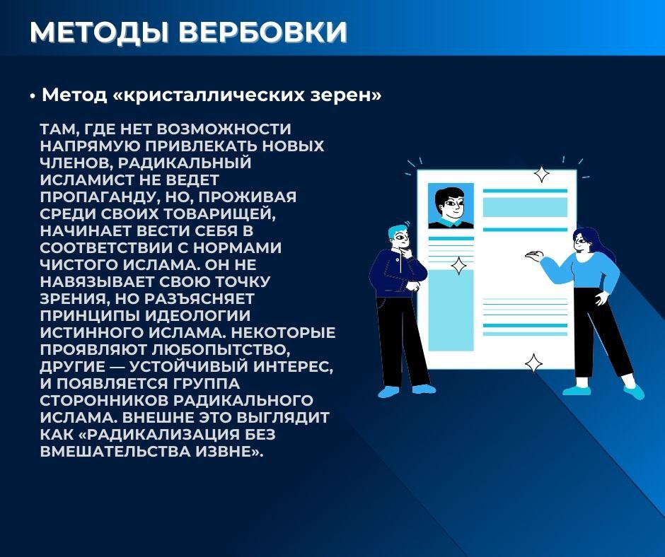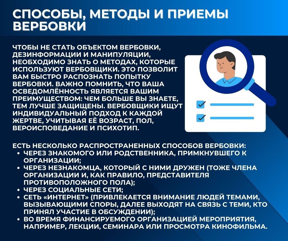 В информационных карточках подготовленных Координационным центром по вопросам формирования у молодежи активной гражданской позиции, предупреждения межнациональных и межконфессиональных конфликтов, противодействия идеологии терроризма и профилактики экстремизма ОГУ имени И.С. Тургенева подробно рассказаны способы защиты от вербовки и мошенничества.