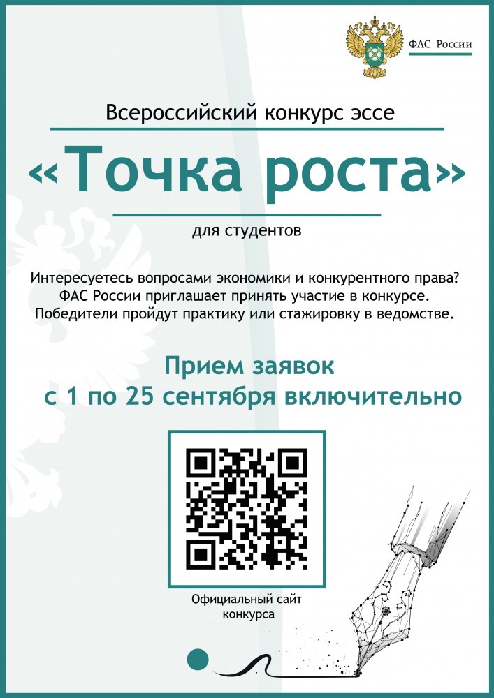 Орловское УФАС России информирует о том, что Федеральная антимонопольная служба (далее – ФАС России) продолжает практику проведения конкурса «Точка роста» для студентов и магистрантов и доводит до сведения, что 1 сентября 2025 года стартует приём заявок на участие в X Всероссийском конкурсе для студентов и магистрантов «Точка роста» (далее - Конкурс).