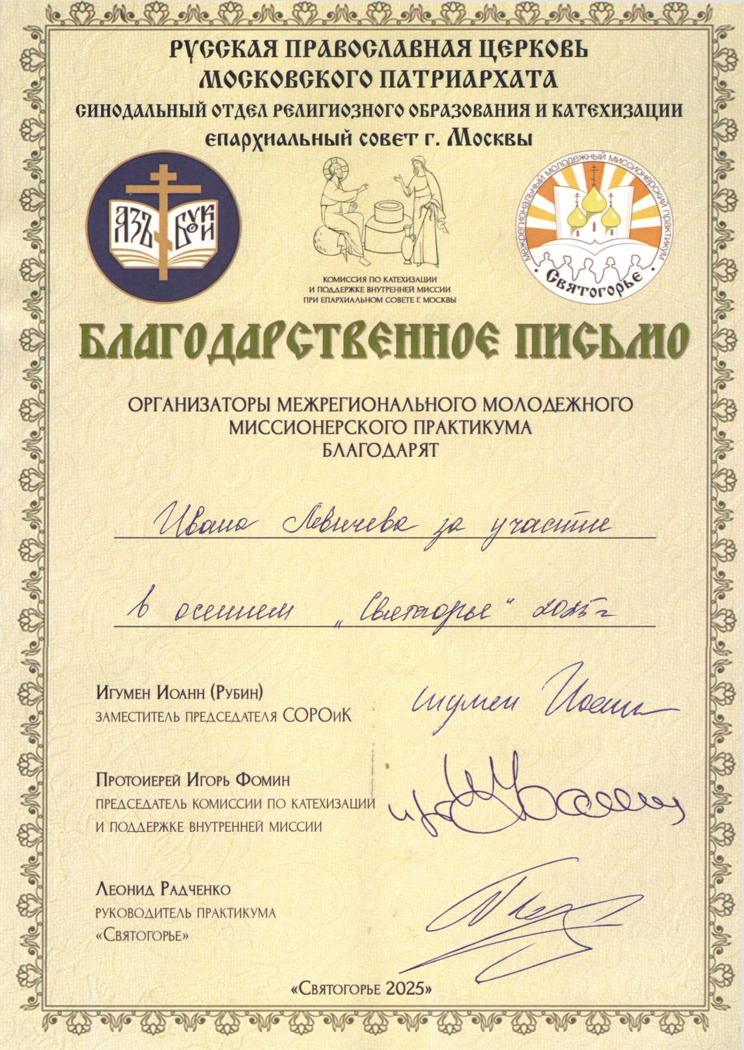 С 8 по 17 сентября 2025 года студенты кафедры теологии, религиоведения и культурных аспектов национальной безопасности ОГУ имени И.С. Тургенева Иван Левичев и Сергей Садырин по итогам экспертного отбора стали участниками ежегодного образовательного семинара «Святогорье» в Новороссийске. Мероприятие, направленное на объединение верующих вокруг Священного Писания и развитие лидерских навыков у актива молодежных движений, проводилось Синодальным отделом религиозного образования и катехизации РПЦ в рамках Патриаршей программы изучения Библии.