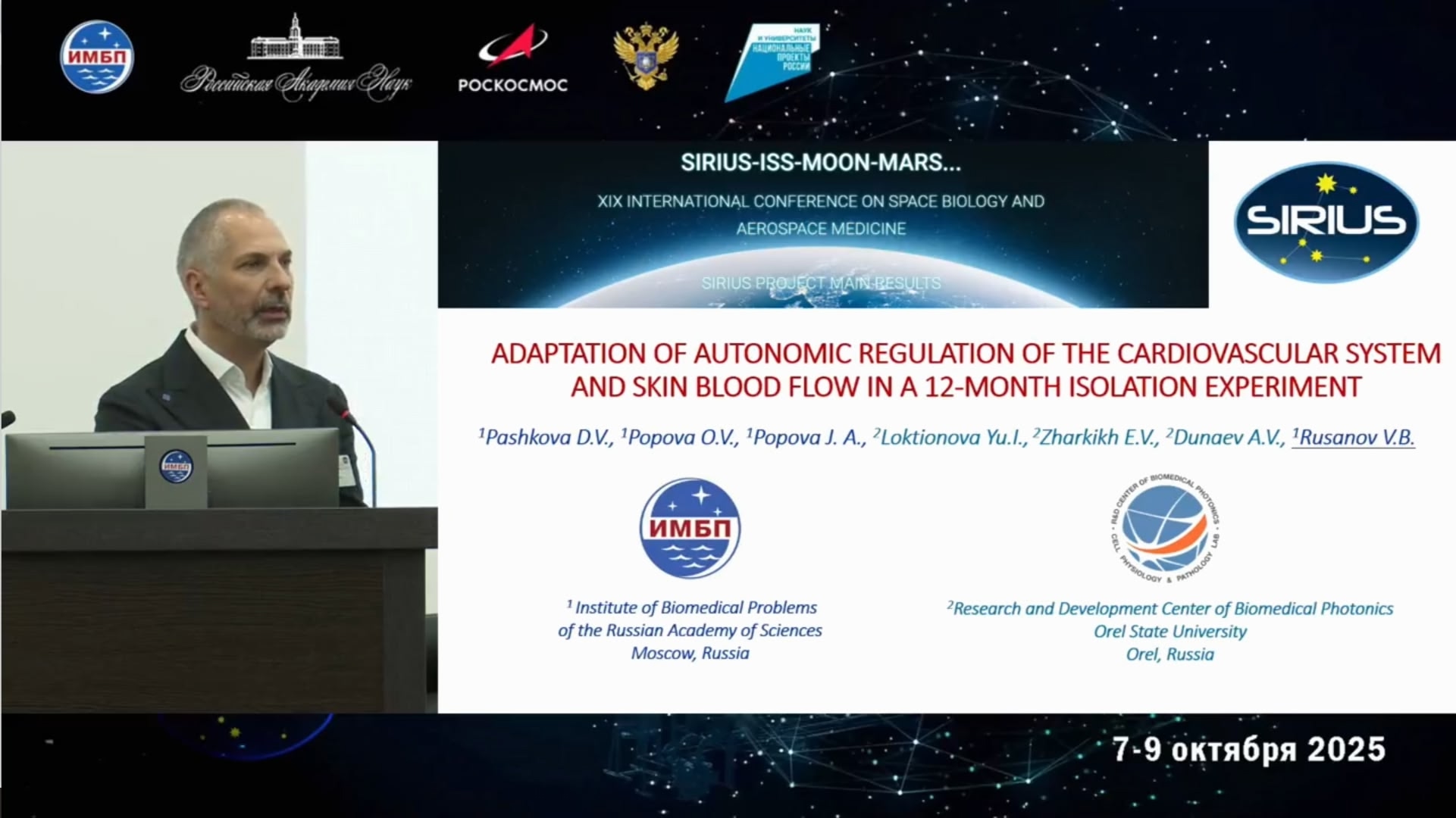 Русанов Василий Борисович (в.н.с., заведующий Лабораторией вегетативной регуляции сердечно-сосудистой системы, д.м.н.) представил совместный с сотрудниками НТЦ биомедицинской фотоники доклад на тему «Адаптационный ответ нейровегетативной регуляции cердечно-сосудистой системы и кожного кровотока в условиях 12-месячного изоляционного эксперимента».