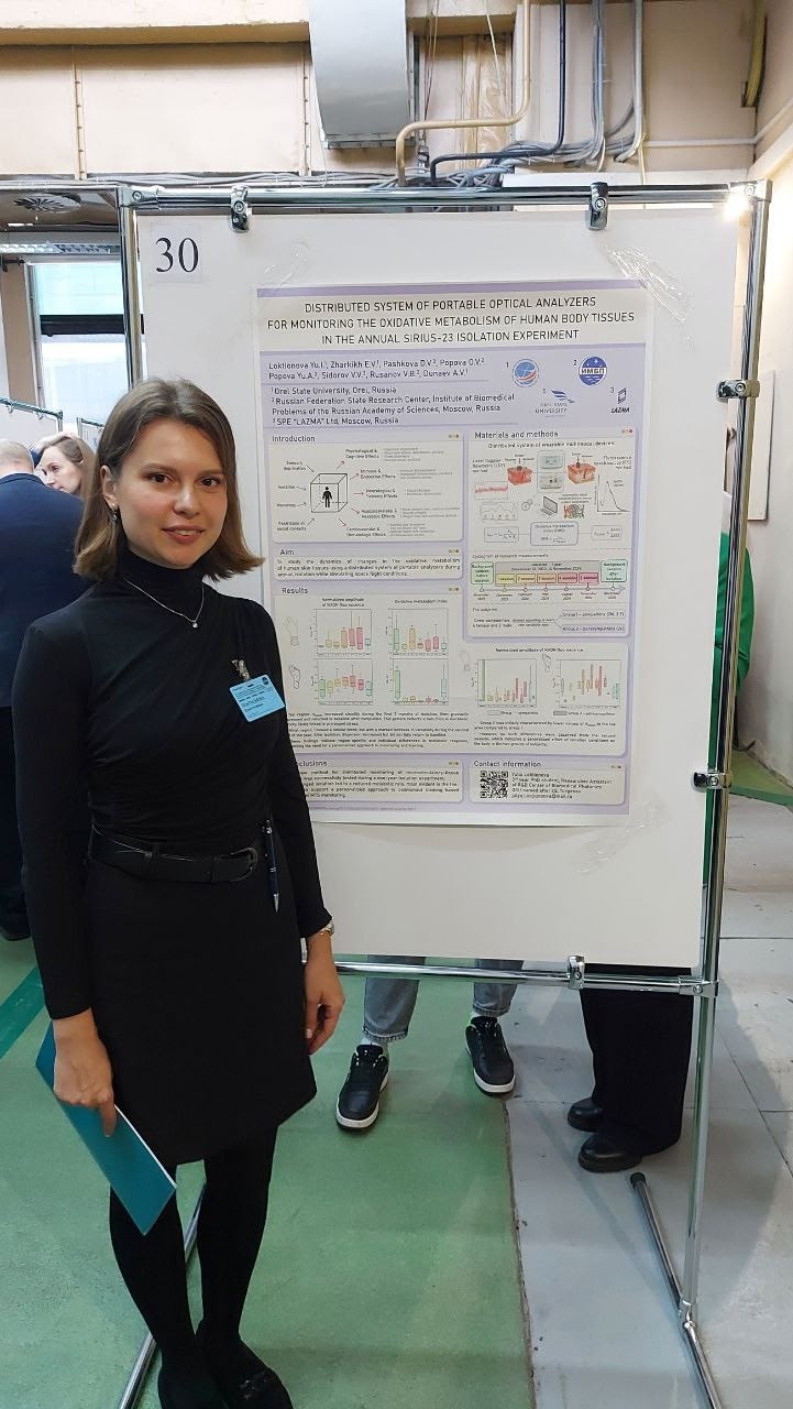 Также по результатам данной работы Юлия Локтионова, стажёр-исследователь НТЦ биомедицинской фотоники ОГУ имени И.С. Тургенева, представила постерный доклад: «Распределённая система портативных оптических анализаторов в мониторинге окислительного метаболизма биотканей организма человека в годовом изоляционном эксперименте SIRIUS-23».