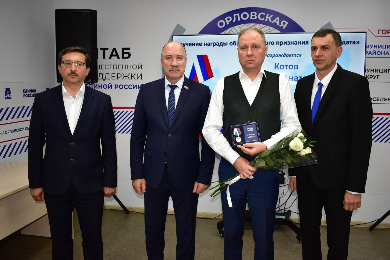 Медалями Общественного признания "Отец солдата" в преддверии Дня отца в Штабе общественной поддержки награждены пятеро орловцев. Главврач Поликлиники ОГУ имени И.С. Тургенева Александр Котов выступил с ответным словом и поблагодарил присутствующих за высокую оценку родительского труда. Сын Александра Анатольевича Сергей, получив ранения на фронте, находится на лечении и награжден медалью Суворова.