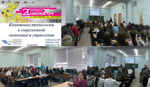 В рамках Всероссийского фестиваля «Наука 0+» 28 октября преподавателями кафедры менеджмента и государственного управления Института экономики и управления ОГУ имени И.С. Тургенева , профессором Ириной Скобляковой, доцентом Натальей Рябининой и доцентом кафедры русского языка как иностранного и межкультурной коммуникации ФПИО Светланой Ефремовой, была организована и проведена научно-популярная лекция-дискуссия на тему: «Квантовые технологии в современной экономике и управлении».