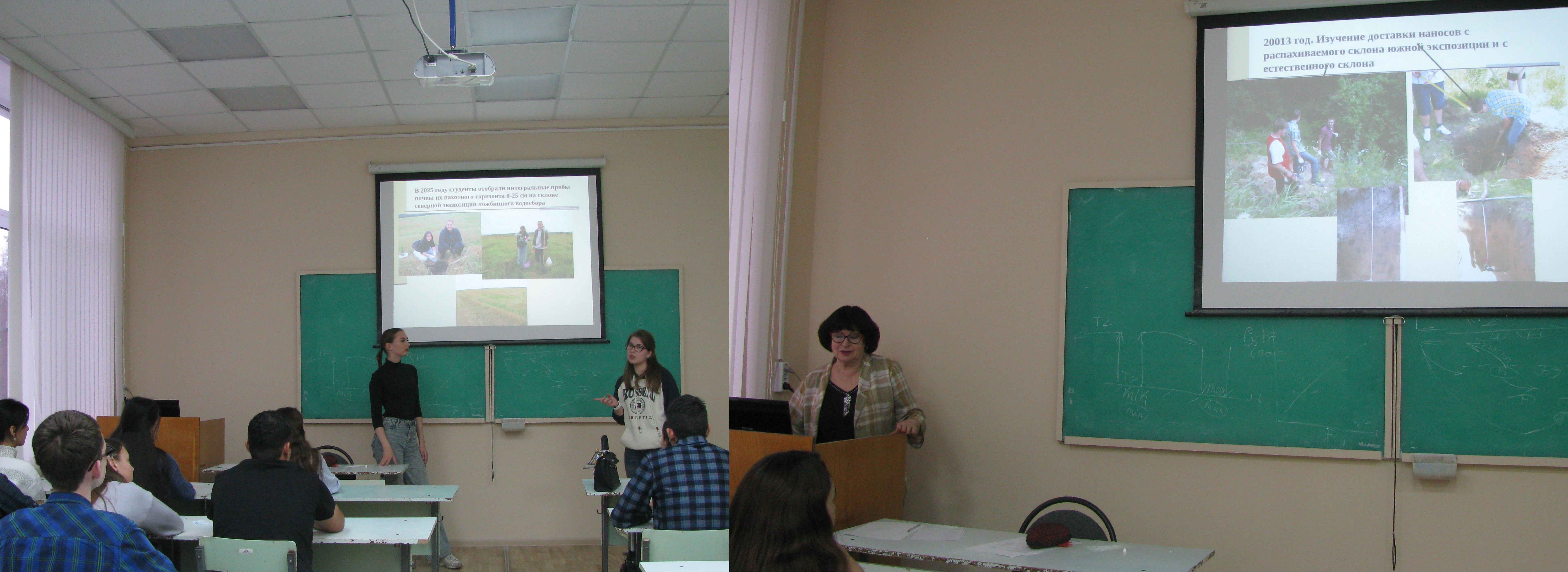 В ходе круглого стола студенты познакомились с результатами работ, проводимых в ОГУ имени И.С. Тургенева. Исследователи Орловского университета имени И.С. Тургенева с помощью изотопа цезия-137 смогли установить, что произошло сокращение интенсивности водной эрозии (из-за которой с сельскохозяйственных земель уносится в овраги, балки и реки плодородный слой почвы) на землях Орловской области после 1986 года в 1,7 – 2,0 раза. Объяснение этому – потепление зимнего сезона. Из-за повторяющихся оттепелей талые воды просачиваются вглубь почвы, не формируя потери ее плодородного слоя.