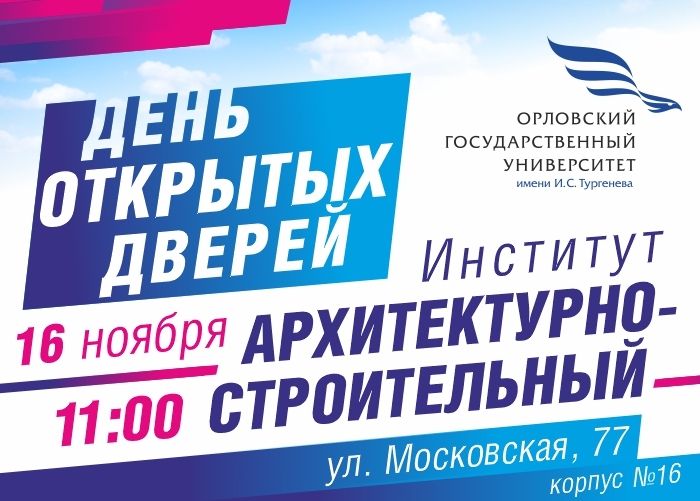 16 ноября 2025 г. в воскресенье в 11.00 в Архитектурно-строительном институте ОГУ имени И.С. Тургенева проводится День открытых дверей. Приглашаются все желающие, в том числе старшекурсники, получающие среднее профессиональное образование, и старшеклассники. Адрес: г Орел, ул. Московская, д. 77. На мероприятии школьникам, их родителям и всем посетителям расскажут полезную информацию и ответят на интересующие вопросы.