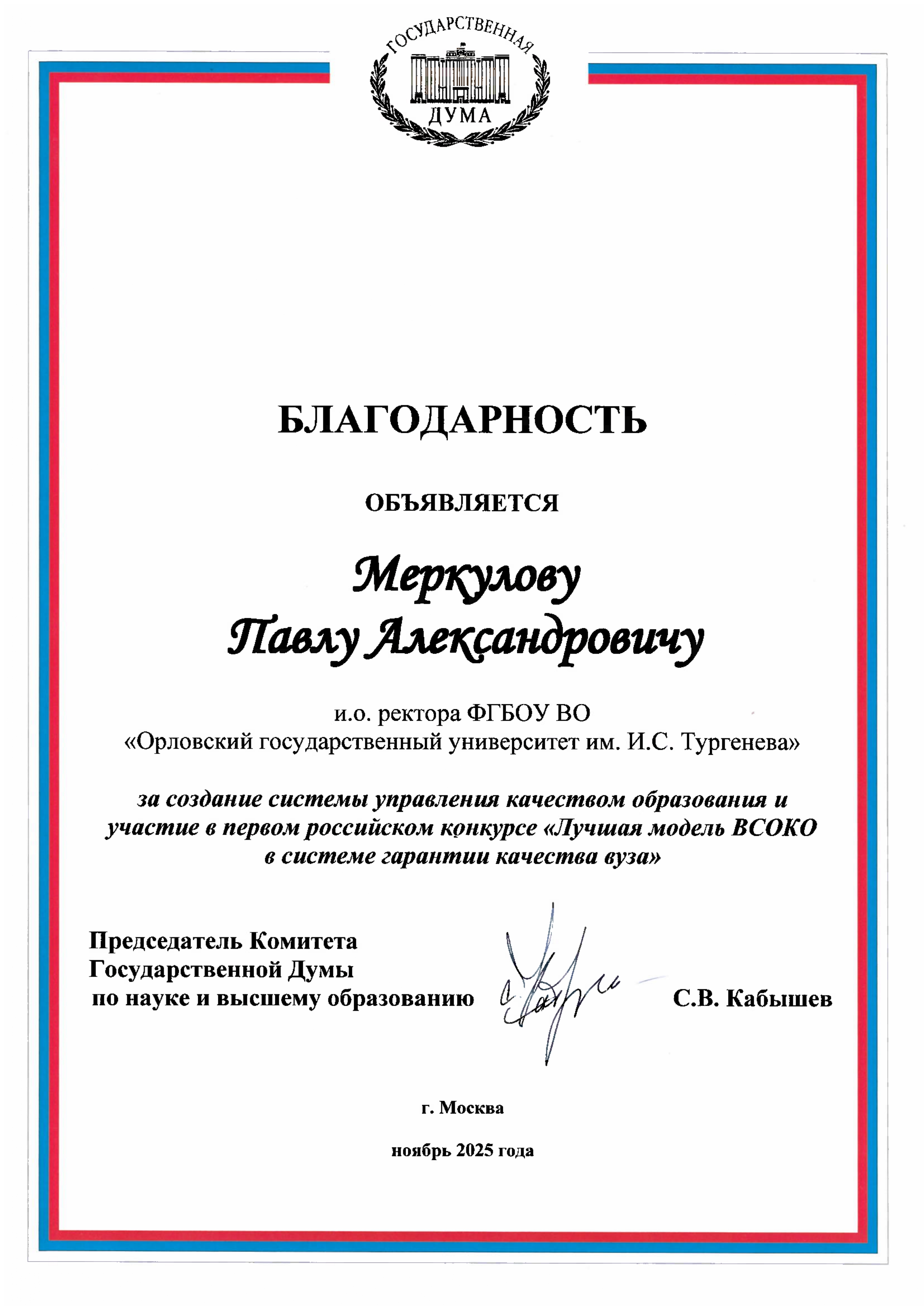 Председатель Комитета Государственной Думы по науке и высшему образованию Сергей Кабышев объявил благодарность за создание системы управления качеством образования и участие в первом российском конкурсе «Лучшая модель ВСОКО в системе гарантии качества в вузе» и.о. ректора ОГУ имени И.С. Тургенева Павлу Меркулову.