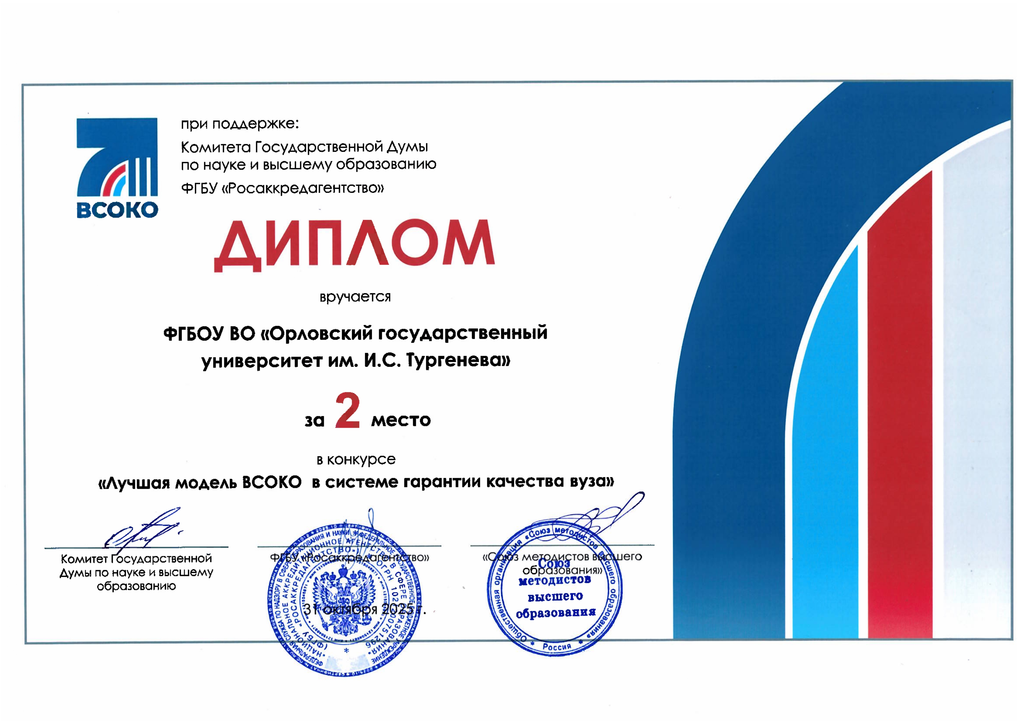 Орловский государственный университет имени И.С. Тургенева вошел в число победителей Конкурса «Лучшая модель ВСОКО в системе гарантии качества в вузе» и занял 2 место