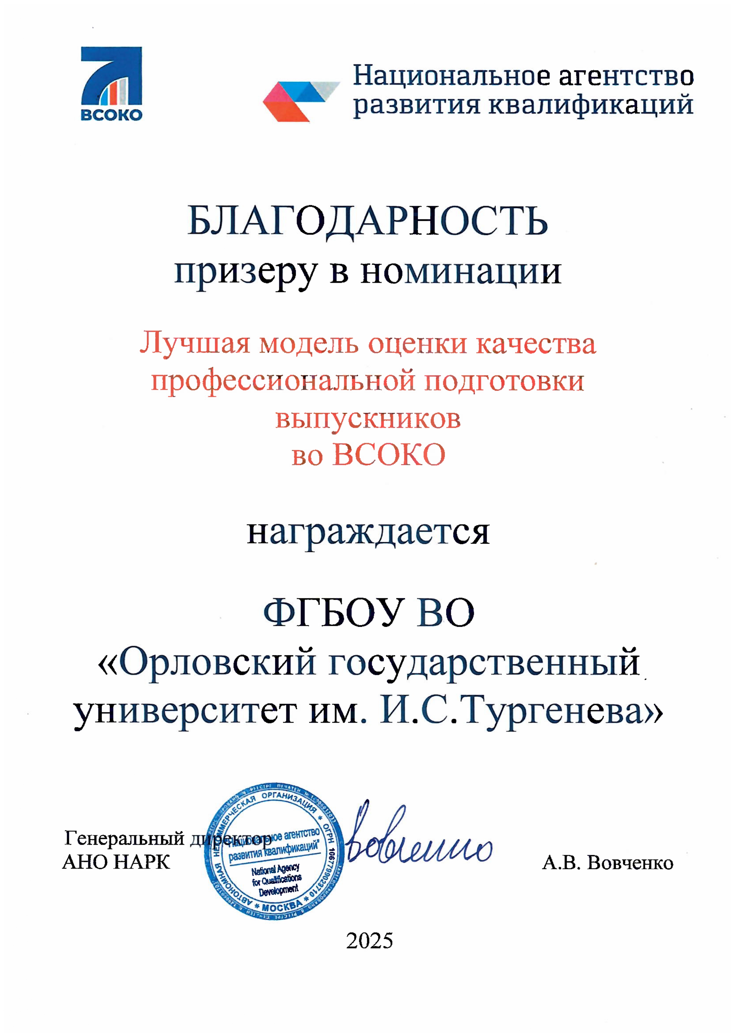 Кроме того, национальное агентство по развитию квалификаций наградило Орловский государственный университет им. И.С. Тургенева как вуз с лучшей моделью оценки качества профессиональной подготовки выпускников во ВСОКО.