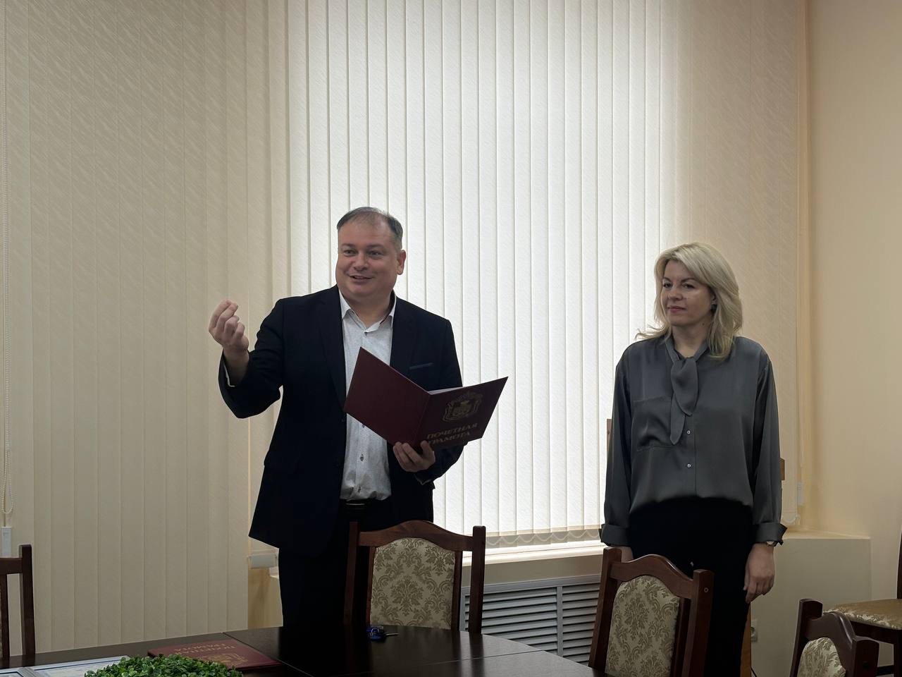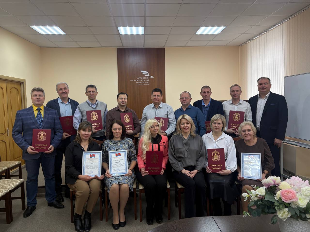 19 ноября, в День преподавателя высшей школы, и.о. первого проректора по образовательной деятельности Оксана Леонова и начальник управления кадрового стратегического развития Дмитрий Торгачев поздравили коллег с праздником и вручили им почётные грамоты и благодарности Орловского областного Совета народных депутатов.
