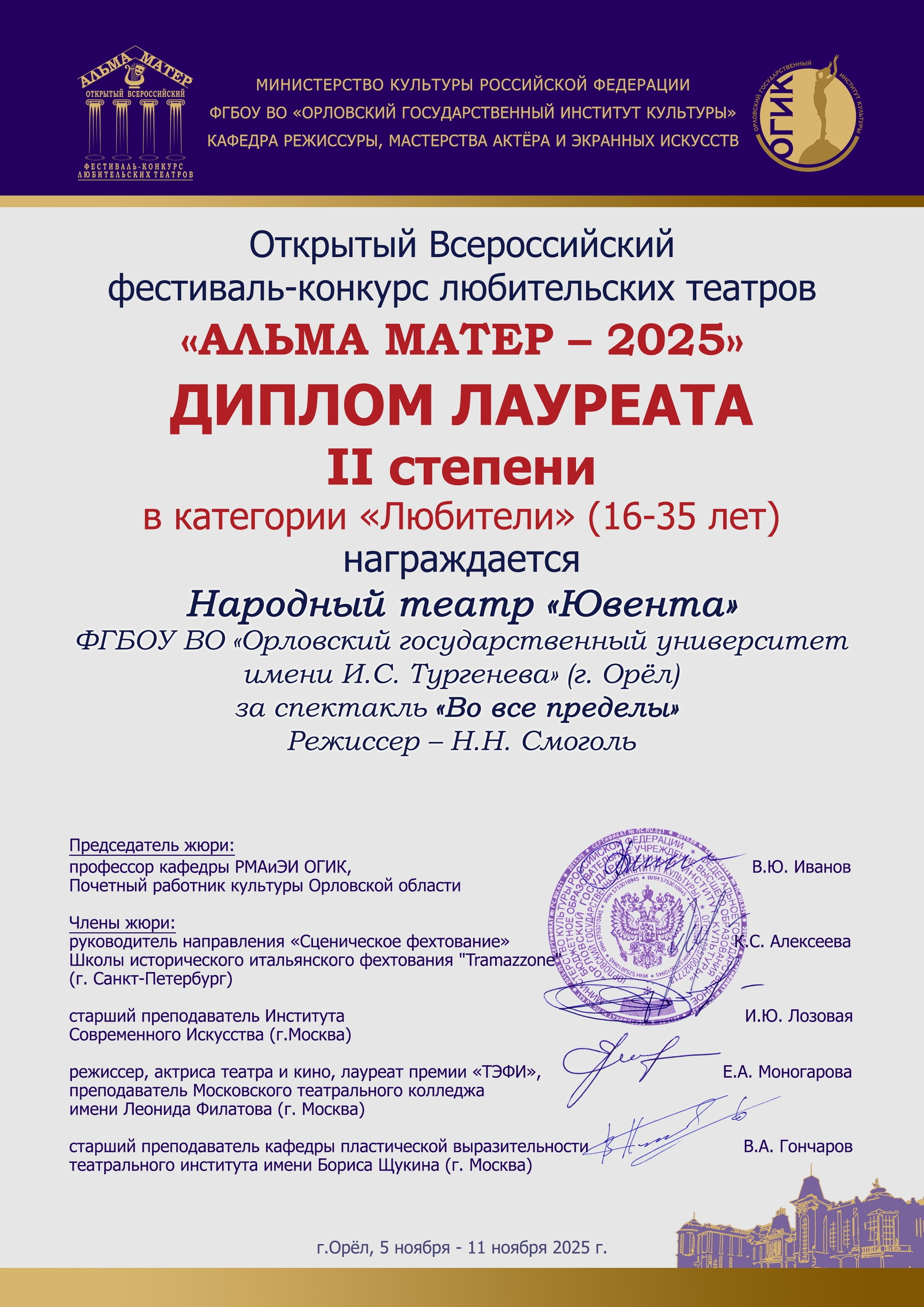 Народный театр «Ювента» получил диплом лауреата 2 степени в категории «Любители» на открытом Всероссийском фестивале-конкурсе «Альма матер - 2025»