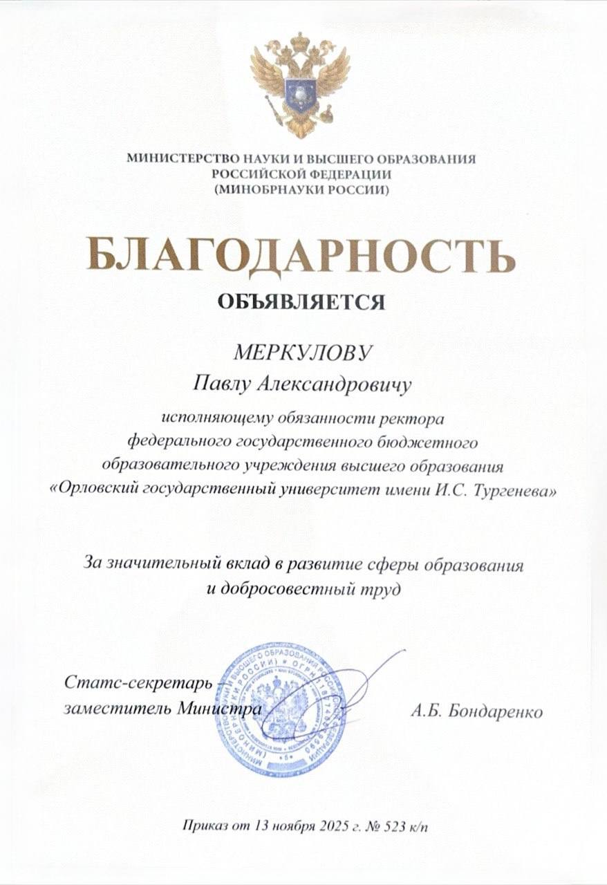 Министерством науки и высшего образования Российской Федерации объявлена благодарность исполняющему обязанности ректора федерального государственного бюджетного образовательного учреждения высшего образования «Орловский государственный университет имени И.С. Тургенева» Меркулову Павлу Александровичу.