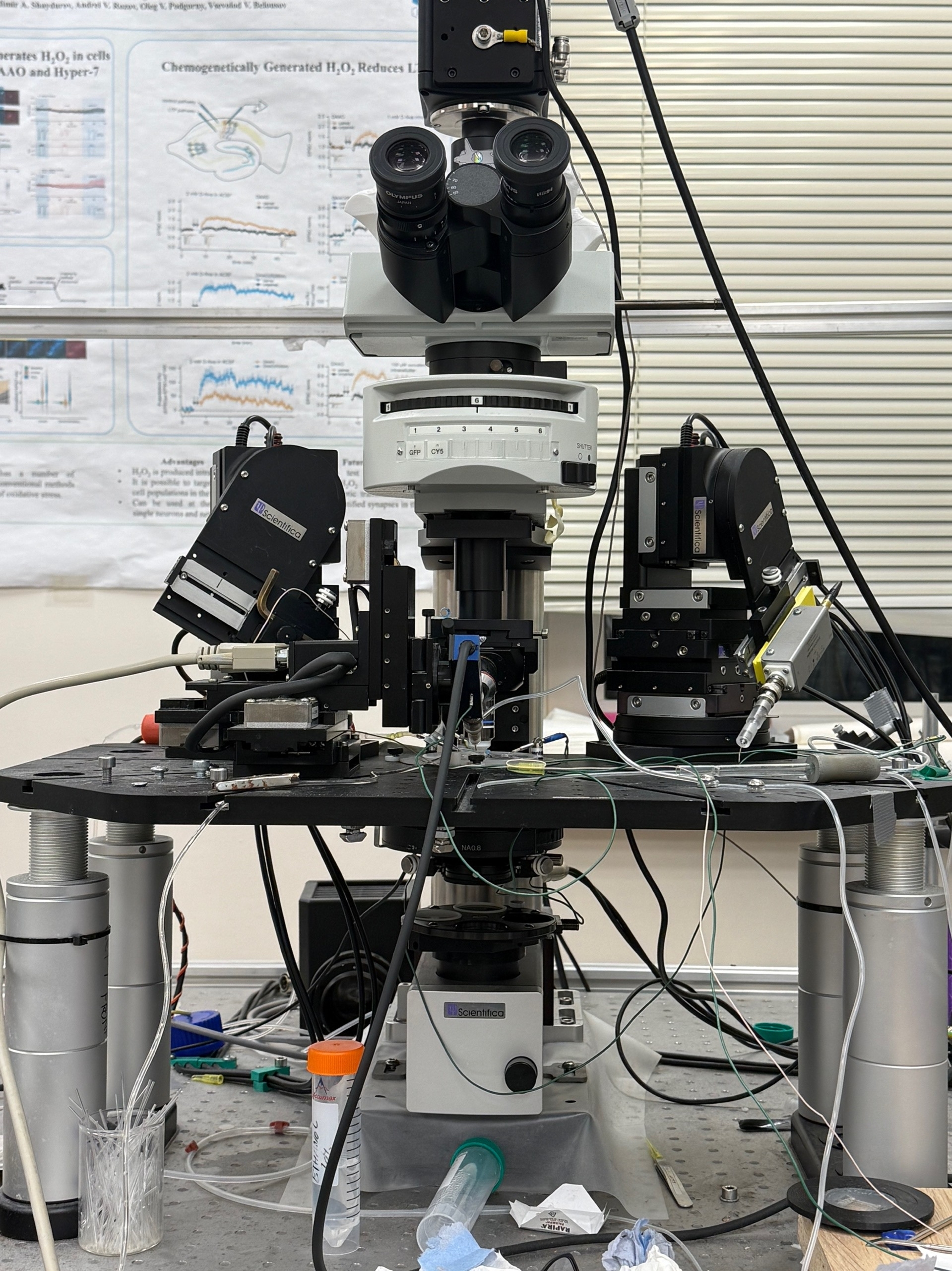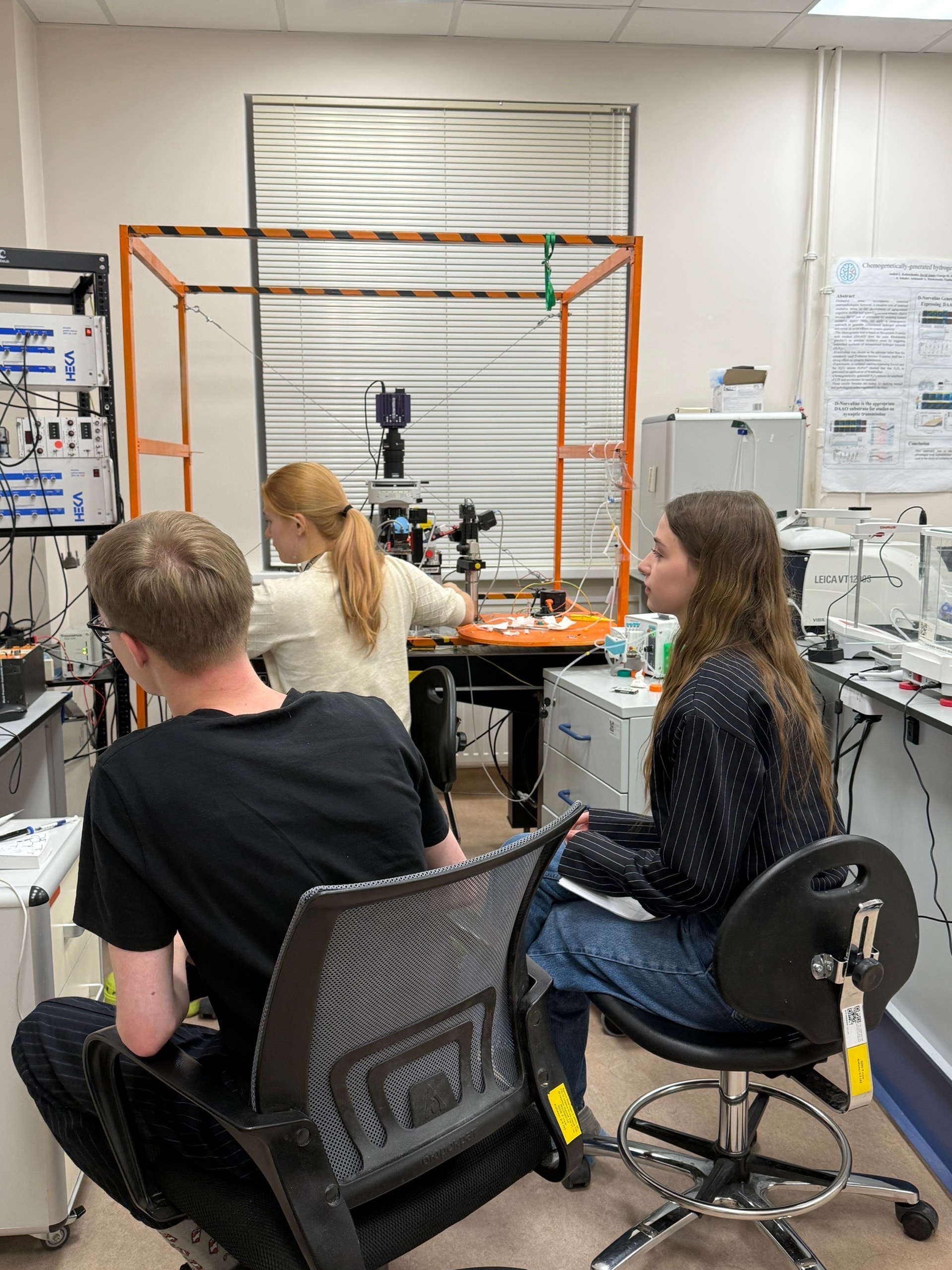 В рамках программы стажировки сотрудники центра лаборант Ягель Татьяна и стажёр-исследователь Мальцева Ксения получили теоретические знания, а также освоили базовые навыки постановки и проведения электрофизиологических исследований. На первом этапе прошло знакомство с устройством и принципами работы оборудования для метода локальной фиксации потенциала: микроманипуляторами, усилителями, анти-вибрационным столом, системой перфузии и микроскопом. Также особое внимание было уделено изучению программ для регистрации сигналов (pCLAMP, HEKA Patchmaster) и подготовке физиологических растворов – внутреннего и искусственной спинномозговой жидкости. В последующие недели были получены практические навыки приготовления переживающих срезов гиппокампа мышей, изготовления стеклянных микроэлектродов, проверки их сопротивления и герметичности, а также проведены эксперименты по методу локальной фиксации потенциала.
