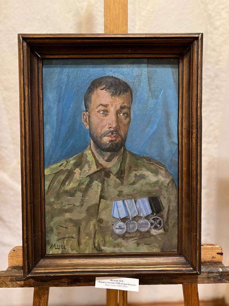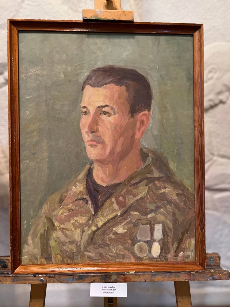 На камерной выставке «Мы вместе» представлена часть портретов героев и участников СВО: портрет Альберта Мухамеджанова, Игоря Васюкова, Дмитирия Рюмина, Рената Назарбаева, Давида Худояна, Александра Марочкина и других.