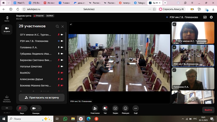03 декабря 2025 года преподаватели, студенты и магистранты кафедры профессионального обучения бизнеса и технологии факультета технологии, предпринимательства и сервиса Орловского государственного университета имени И.С. Тургенева приняли участие в работе IV круглого стола «Пространственная экономика: обсуждение актуальных позиций и ключевых точек зрения в контексте перспектив развития» (с международным участием). Организатором выступил Национальный институт бизнеса, г. Москва.