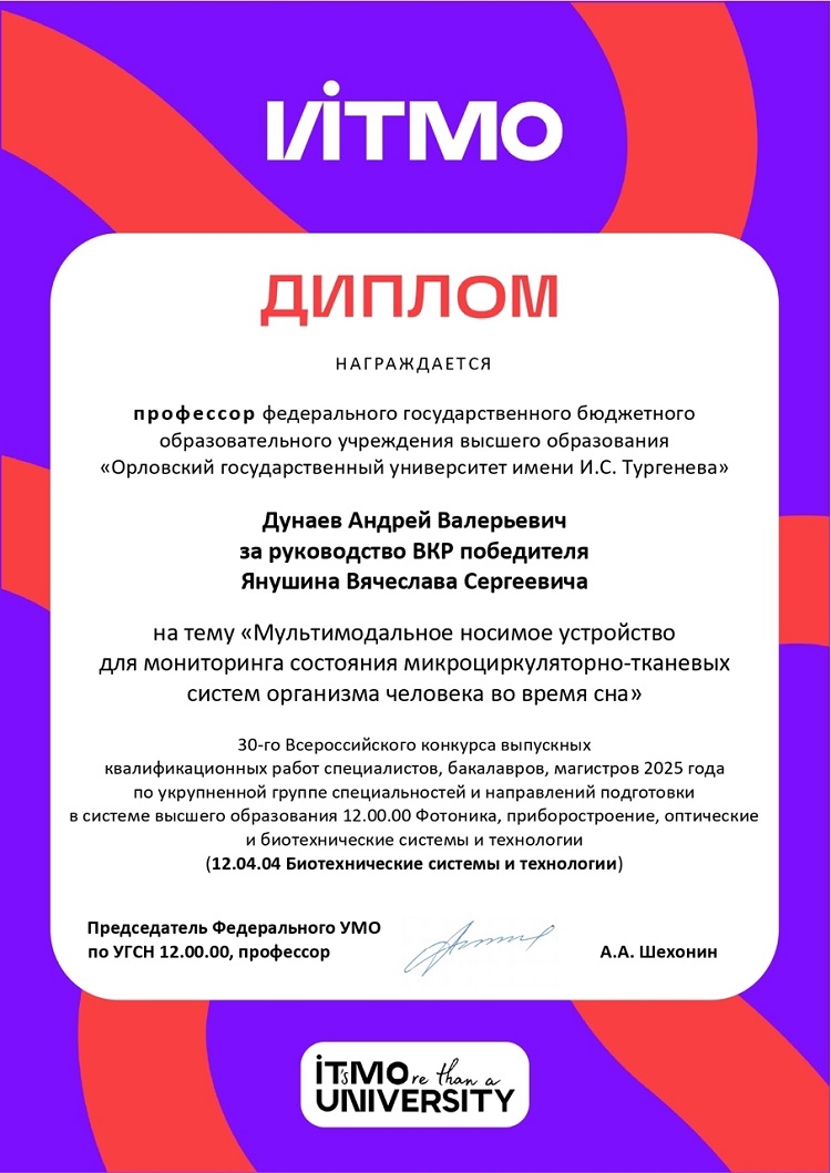 Дипломом I степени награждён Вячеслав Янушин, стажёр-исследователь НТЦ биомедицинской фотоники, за выпускную квалификационную работу «Мультимодальное носимое устройство для мониторинга состояния микроциркуляторно-тканевых систем организма человека во время сна».
