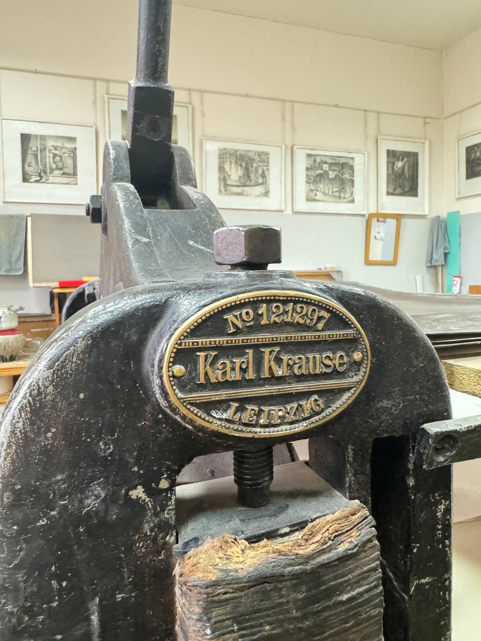 Особую историческую и технологическую ценность представляет материальная база университета. Сердцем процесса остается немецкий литографский станок фирмы Karl Krause, созданный еще в девятнадцатом веке. Это массивное оборудование — настоящий шедевр инженерной мысли прошлого. На его чугунной станине сохранилось подлинное клеймо торгового дома из Санкт-Петербурга с буквами дореволюционного алфавита. Тот факт, что станок до сих пор находится в идеальном эксплуатационном состоянии, говорит о колоссальном запасе прочности и точности механизмов, которые по сей день позволяют получать оттиски мирового уровня.