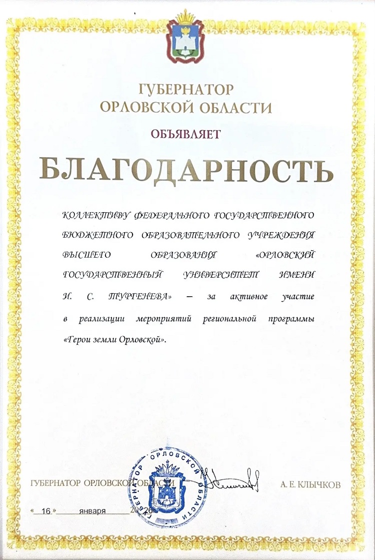 27 января 2026 года в Орловском государственном академическом театре им. И.С. Тургенева, на торжественной церемонии закрытия Года Защитника Отечества, Орловский государственный университет имени И.С. Тургенева был отмечен благодарностью Губернатора Орловской области за активное участие в реализации региональной программы «Герои земли Орловской».
