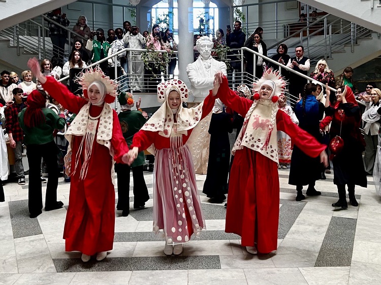Затем в зале заиграла музыка, и студенческий ансамбль «Триумф» представил зрителям русские народные танцы, а под зажигательные частушки пританцовывали уже все участники и гости мероприятия.