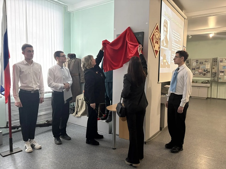 Под звуки торжественной музыки покрывало с мемориальной доски было снято. Студенты и преподаватели возложили живые цветы и почтили память воина.