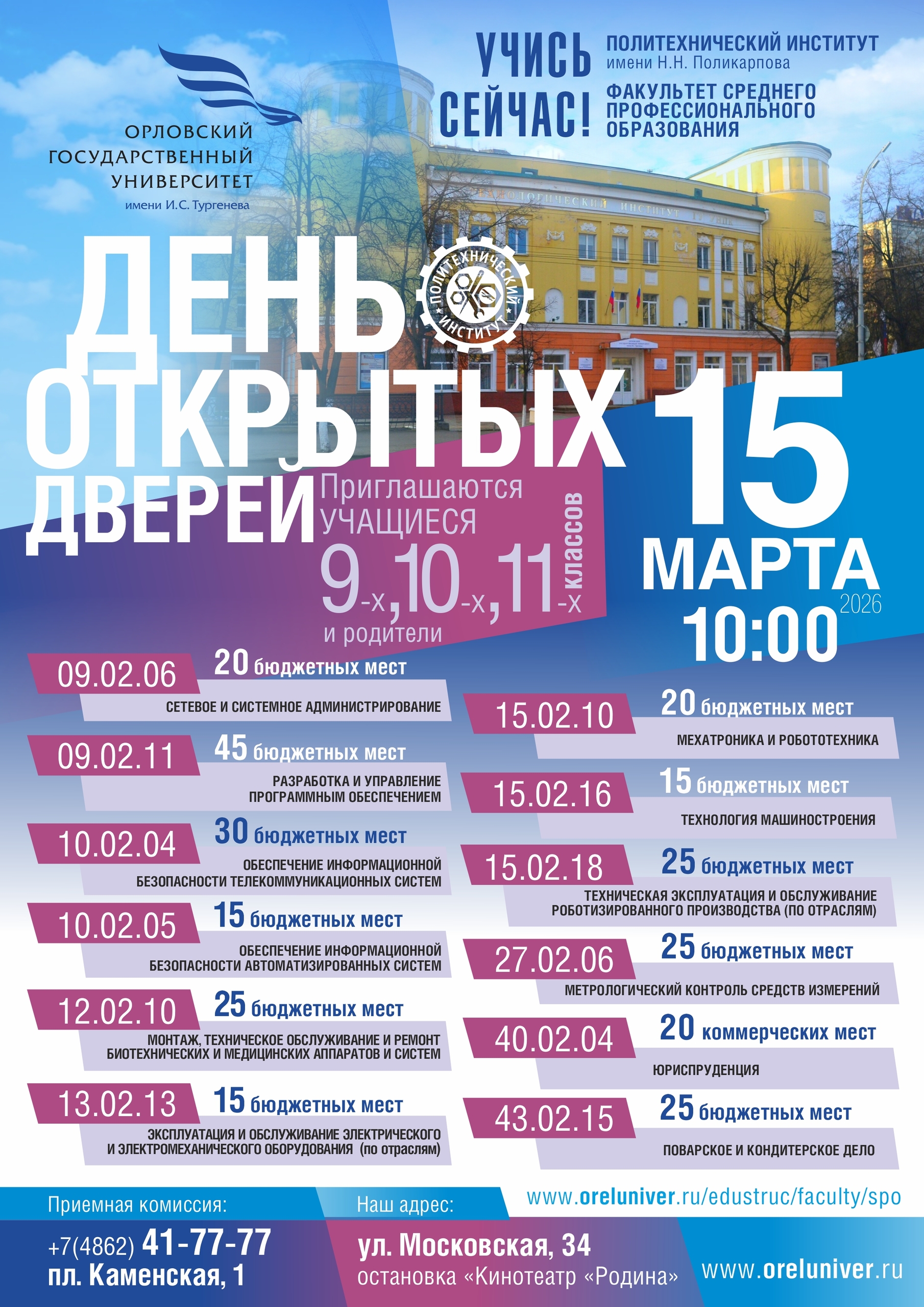 15 марта в 10:00 на факультете среднего профессионального образования Орловского государственного университета имени И.С. Тургенева пройдет День открытых дверей.