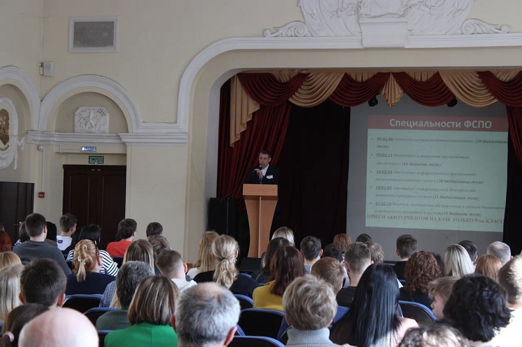 Декан факультета Андрей Корнеев, доктор технических наук, в своем выступлении подробно рассказал о каждой специальности, указал количество бюджетных мест и минимальный проходной балл по прошлому году. "Благодарим всех, кто пришел познакомиться с нами! Ждем вас в рядах наших студентов!" - подытожил мероприятие Андрей Юрьевич.