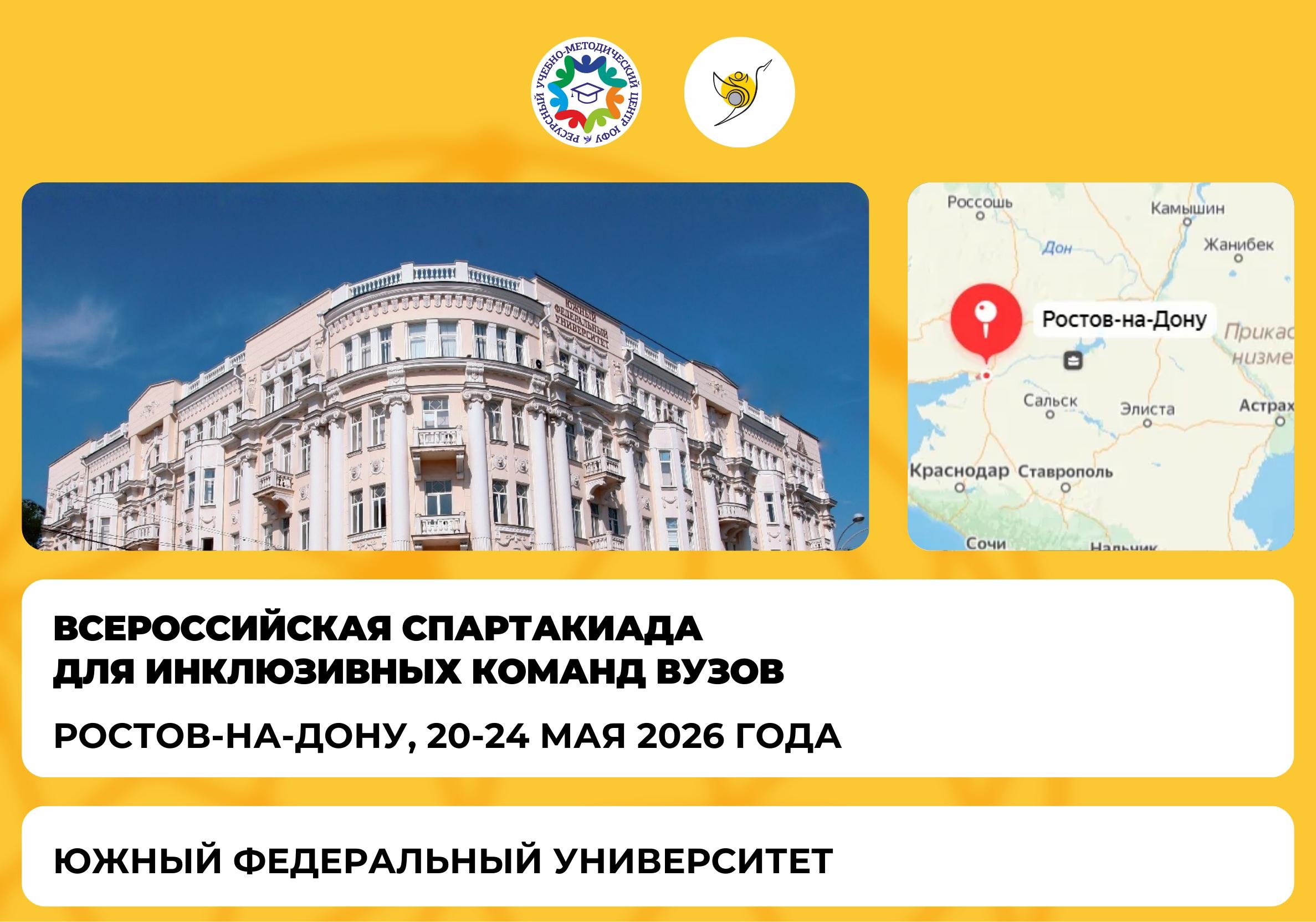 Минобрнауки России объявило о проведении Всероссийской студенческой Спартакиады по инклюзивному спорту «Спорт без границ», которая пройдет с 20 по 24 мая 2026 года на базе Южного федерального университета.